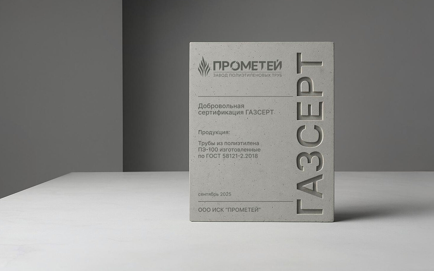 ИСК «Прометей» оформило сертификат соответствия в Системе добровольной сертификации ГАЗСЕРТ на трубы из полиэтилена (ПЭ 100) однослойные для транспортирования газообразного топлива номинальными наружными диаметрами 32 мм (SDR 9-26), 63 мм (SDR 9-26), от 90 мм до 125 мм (SDR 9-26), от 160 мм до 400 мм (SDR 9-26), 450 мм (SDR 11-21), от 500 мм до 560 мм (SDR 17-21), 630 мм (SDR 17,6-21), выпускаемые по ГОСТ Р 58121.2-2018 (ИСО 4437-2:2014) «Пластмассовые трубопроводы для транспортирования газообразного топлива. Полиэтилен (ПЭ). Часть 2. Трубы».